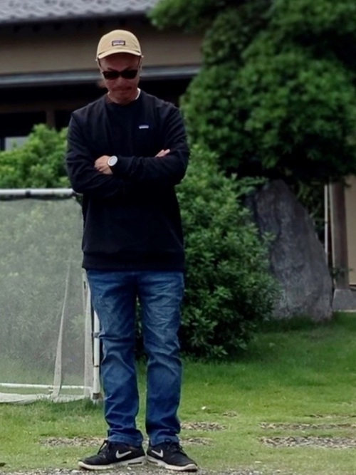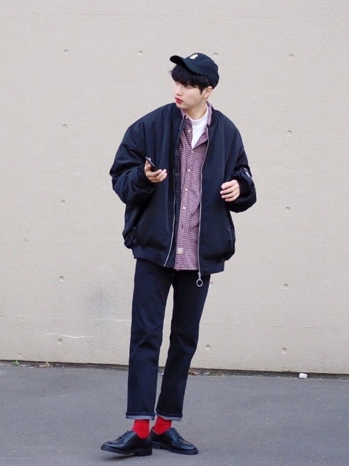 ミリタリーアイテムであるMA-1もグラミチのデニムパンツとの相性は抜群。MA-1、靴とデニムパンツを同系色でそろえているので、シャツや靴下のカラーが差し色として効いています。