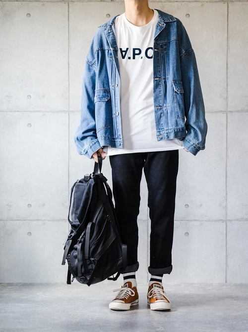 ビッグシルエットのアウターには細身なシルエットのデニムパンツを合わせてみましょう。ゆったりとしたアウターに細身のデニムを合わせることで、パンツのきれいなシルエットを際立たせられます。全体的にシンプルな着こなしですが、靴下やスニーカーなど足元で遊び心をプラス。
