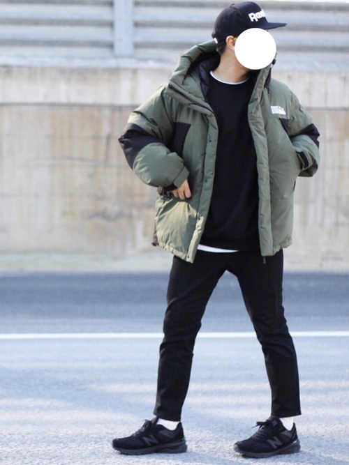 グラミチの細身なデニムパンツにダウンジャケットを合わせたメンズコーデです。全体を暗い色のアイテムでそろえると重たく見えがち。しかし、あえて全体をブラックなどのアイテムでそろえることで統一感のあるコーデに仕上げています。