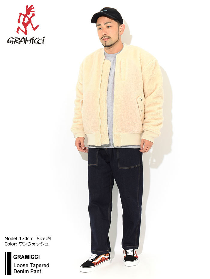 タイトなシルエットのものが多いグラミチですが、もちろんルーズシルエットのジーンズもあります。ルーズシルエットのジーンズを探している方にはルーズテーパードデニムパンツがおすすめ。素材には10オンスのストレッチデニムが使われ、9分丈のデザインになっているのでこなれ感を出すこともできます。