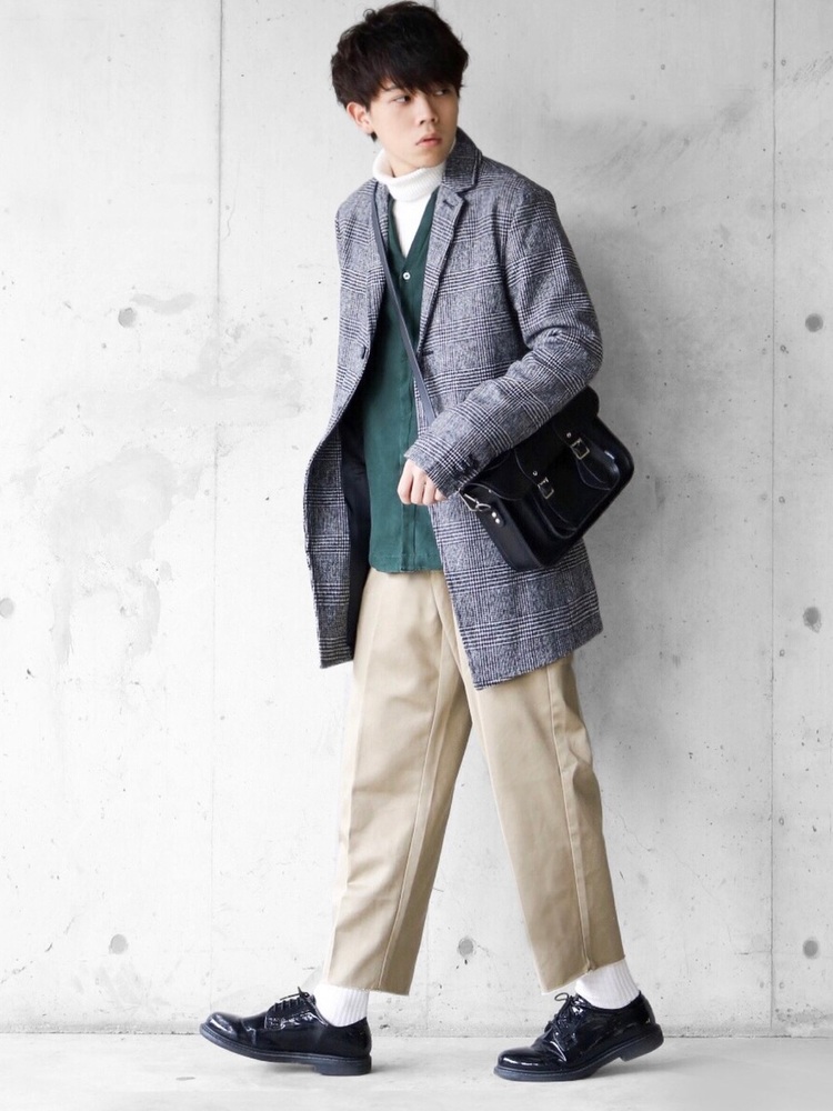 こちらは、チェック柄のグレーチェスターコートにワークパンツを合わせ、インナーのグリーンでアクセントを加えたフレンチカジュアルコーデ。全体を見ても生地感的にカジュアルな印象が強いので、革靴で引き締めている点が着こなしのポイントです。また、インナーの白と靴下の白をリンクさせ、統一感も演出しましょう。