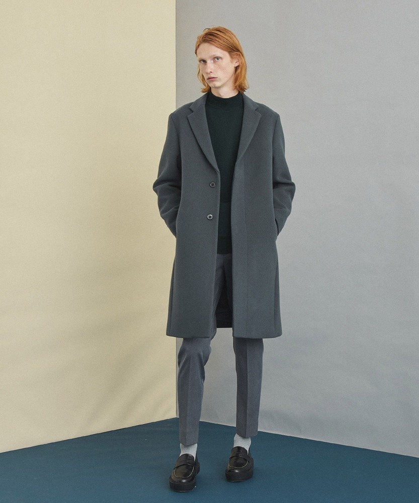 こだわり抜かれたウールを使用し、上品な生地感に仕上げたグレーチェスターコート。ふっくらした生地感で発色もよく、安物感のないアウターとなっています。