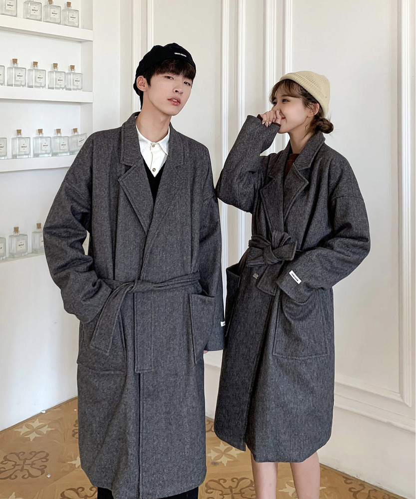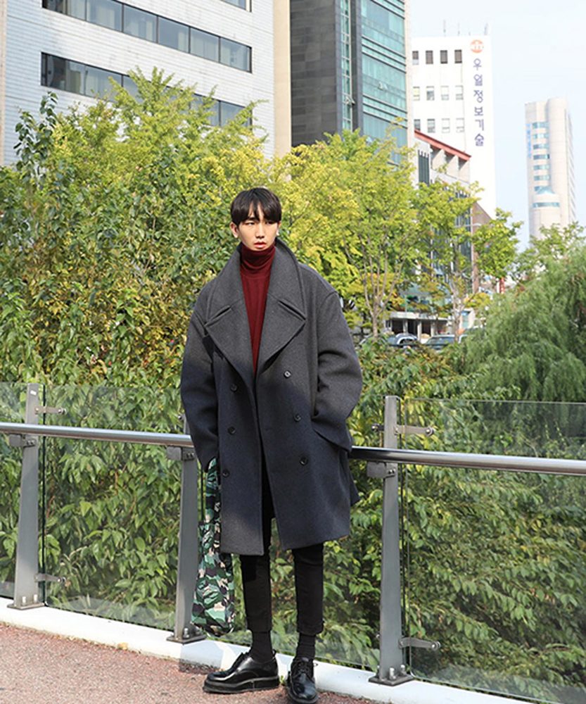 襟が大きいつくりとなっており、マフラーをつけずとも首元に存在感を出せるグレーチェスターコート。色もダークトーンなので大人っぽく、スキニーパンツなど韓国系ファッションとの相性も抜群です。