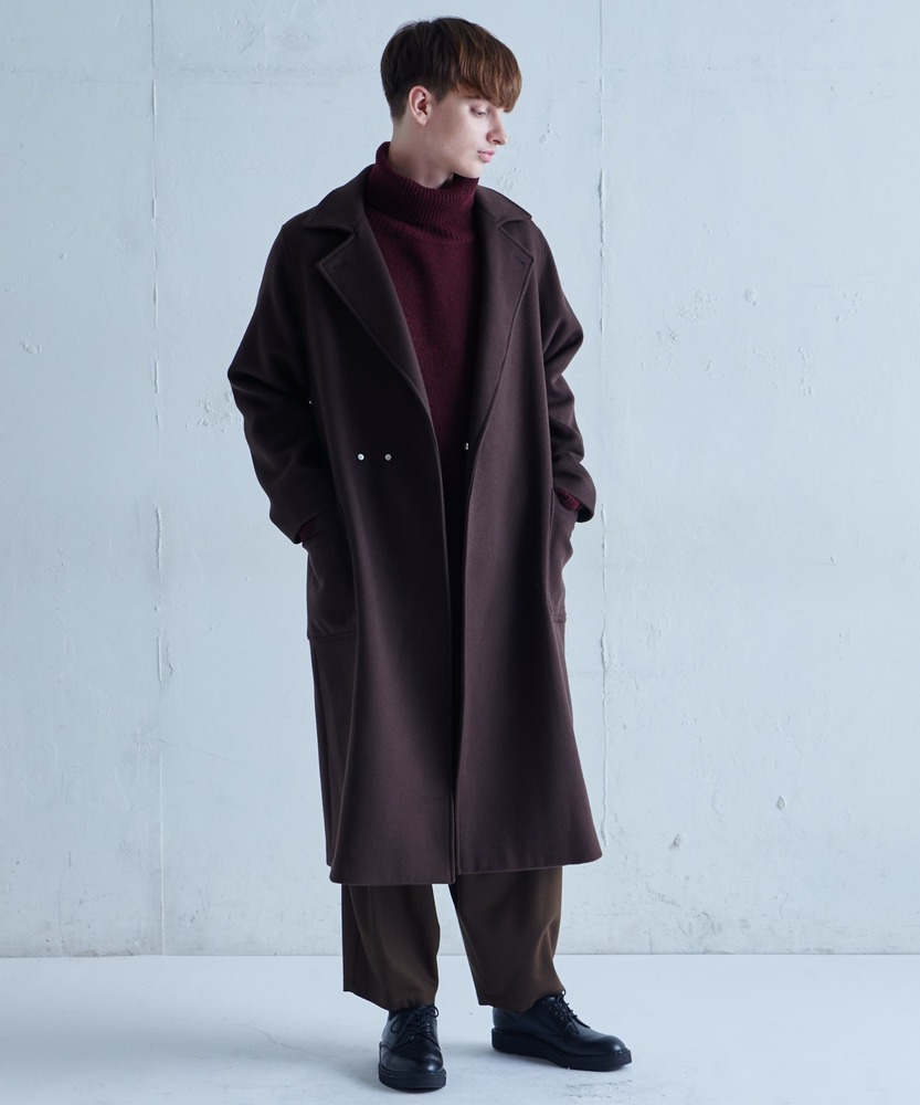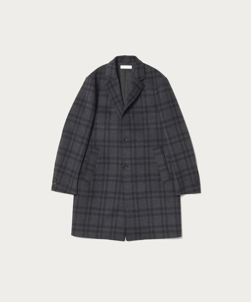 原材手配から加工、仕上げまで全ての工程にこだわりを持ってつくられたビッグシルエットのグレーチェスターコート。希少な原料である17.5マイクロンのウールにナイロンやポリエステルを配合し、ハリ感のある丈夫なアウターに仕上げています。