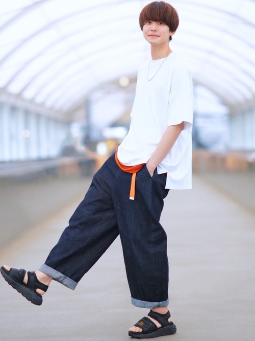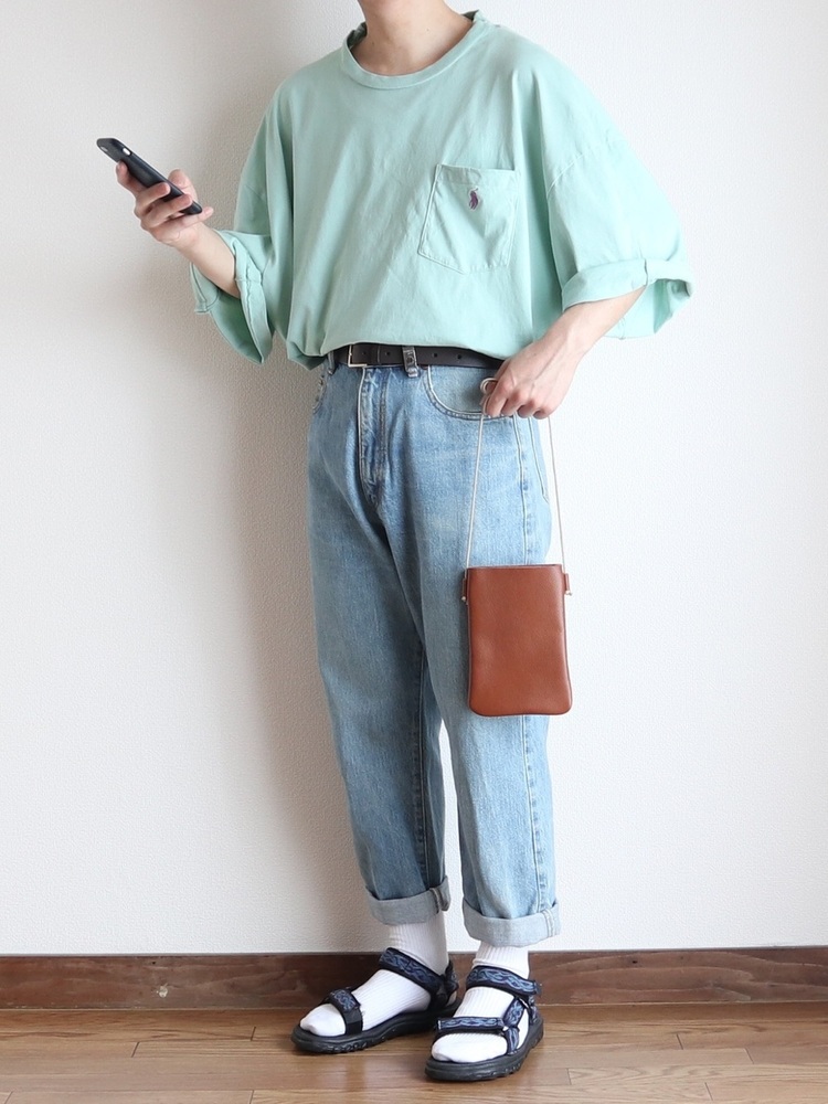 Tシャツをタックインにして、デニムはあえて色あせたカラーを選んでいますが、不思議とおしゃれに見える着こなしです。足元の靴はサンダルで整えることで、よりラフな印象を与えてくれます。オーバーサイズのTシャツがかわいく見えます。タックインのTシャツとサンダルが、なんとも言えないマッチング感を出しています。