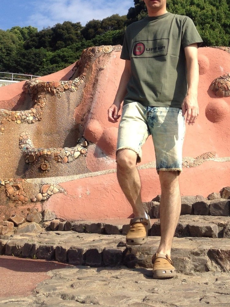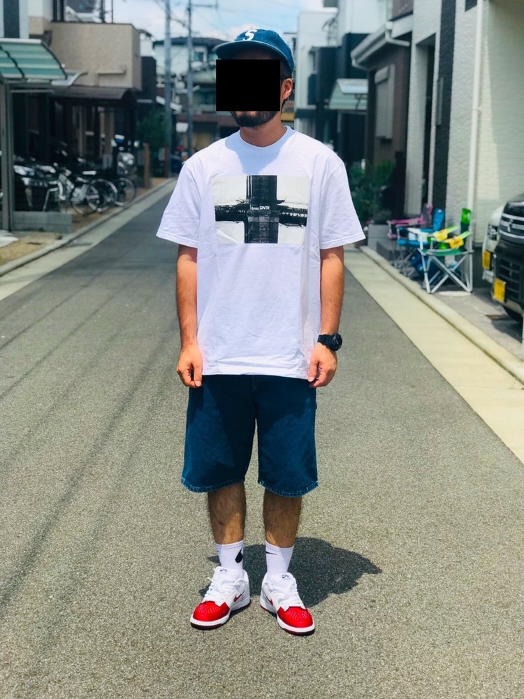 ハーフジーンズとTシャツは、不滅の組み合わせと言えます。少しだけダメージが加えられ、さらには色あせ感のあるデニムを選べば、ワイルドなメンズコーデが完成します。足元の靴からTシャツまで、スキのないコーデに仕上がっています。