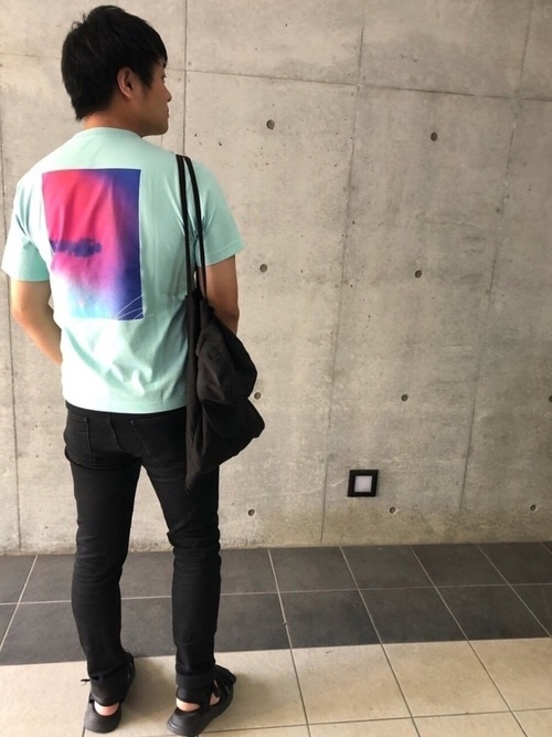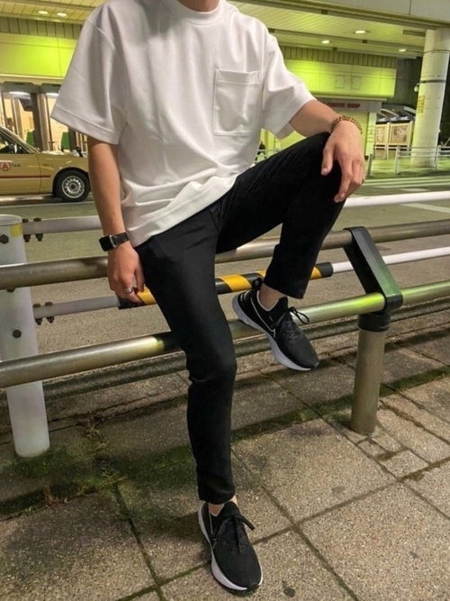 シンプルなでおしゃれと呼べるメンズコーデです。少し大きめのTシャツに見えるかもしれませんが、無理なオーバーサイズではなく、身幅、裾の着丈などが合っていますので綺麗な着こなしに見えます。ブラックジーンズを選ぶことで、全体的に締まって見えます。