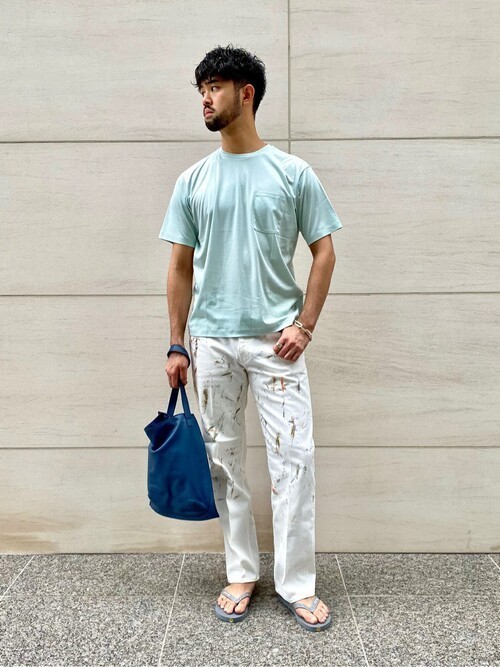 これぞジャストサイズコーデと等呼ぶなふさわしい、Tシャツとジーンズコーデです。Tシャツの裾もベストで、デニムパンツも爽やかにフィットしています。足元の靴と、Tシャツとのカラーを合わせるだけで、おしゃれな雰囲気が増します。