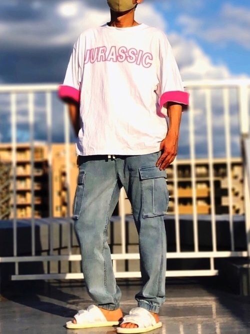 今、おしゃれでかっこいいと評価が高いのが、このTシャツとビッグジーンズとを組み合わせらメンズコーデです。少しオーバーサイズのデニムを選んでも、シンプルなTシャツを選べばおしゃれで違和感なくまとめることができます。足元の靴はサンダルを選ぶのも基本です。