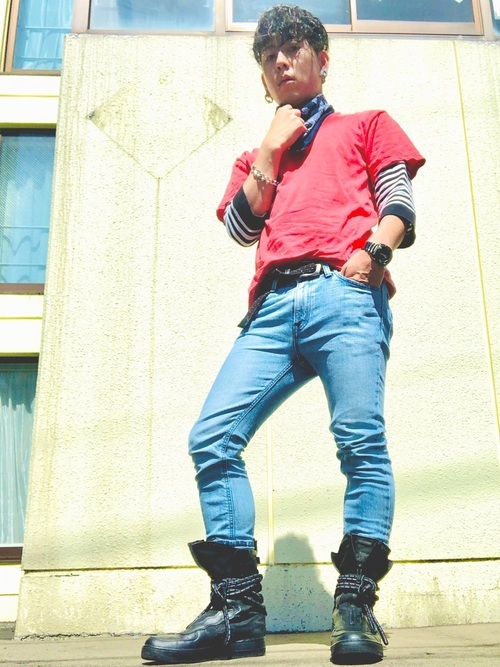Tシャツとジーンズで、ワイルドなコーデに仕上げてみましょう。足元の靴がサンダルでも、全体のカラー選びやTシャツとデニムパンツのサイズによっては、簡単にワイルドコーデを完成できます。