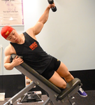いかり肩にした状態からダンベルを挙げていきます。この時に少し外方向に凱旋させ、ダンベルを回すように動かすとスムーズに動作ができます。