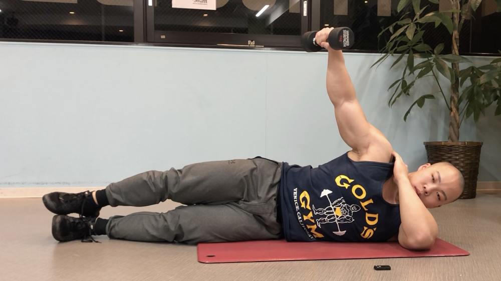 まずは床やマットの上、フラットベンチなどに横向きに寝ころびましょう。そしてダンベルを身体の横から少し前の位置で持ちます。