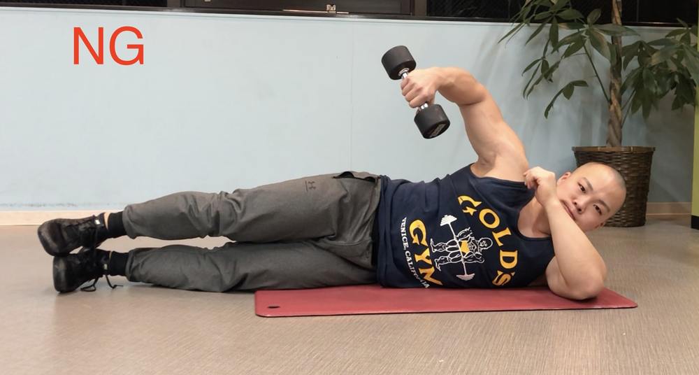 ライイングサイドレイズは肩関節が下がったまま行ってはいけません。なぜなら動きの軸が中心に通りやすく、僧帽筋に効きやすくなるからです。