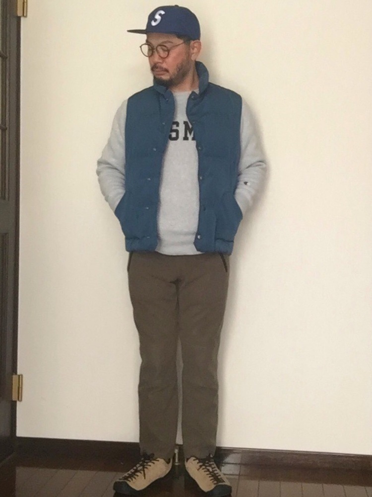 続いて、スウェットシャツにダウンベストを合わせたコーデ。ダウンベストはアウター使いすることでトップスの袖が見え、よりラフでこなれ感のある着こなしになります。