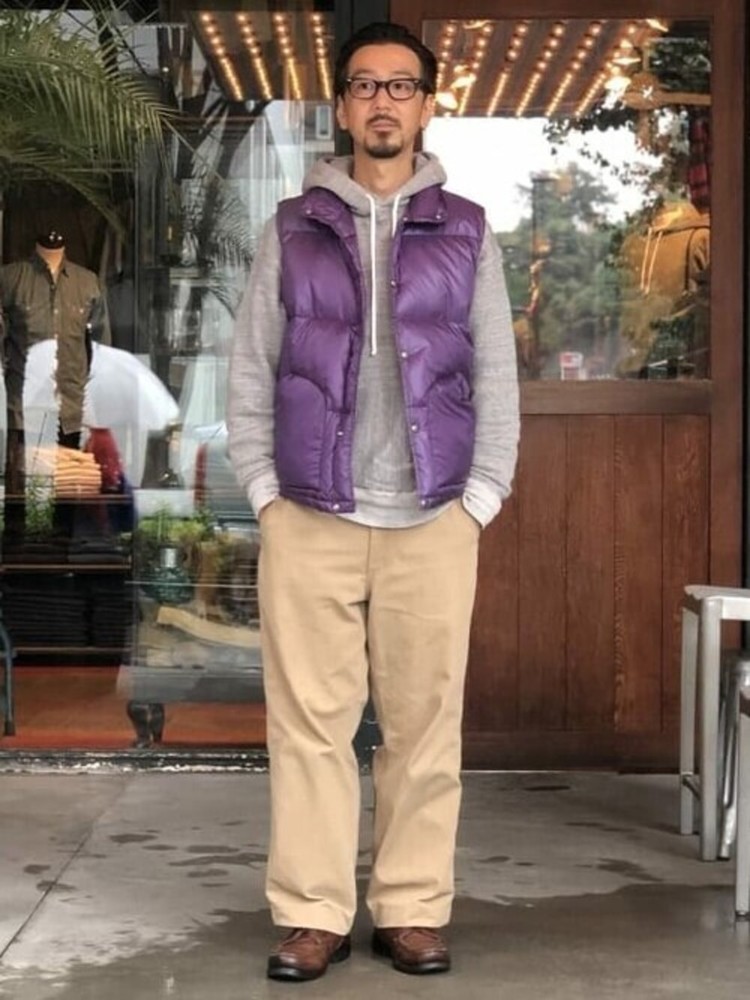 こちらはパープルのダウンベストをコーデのアクセントにしたコーデです。ダウンベスト以外は落ち着いたカラーのアイテムで統一、カラーアイテムの1点投入で一気に差をつけられます。