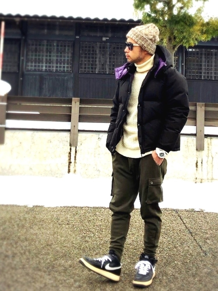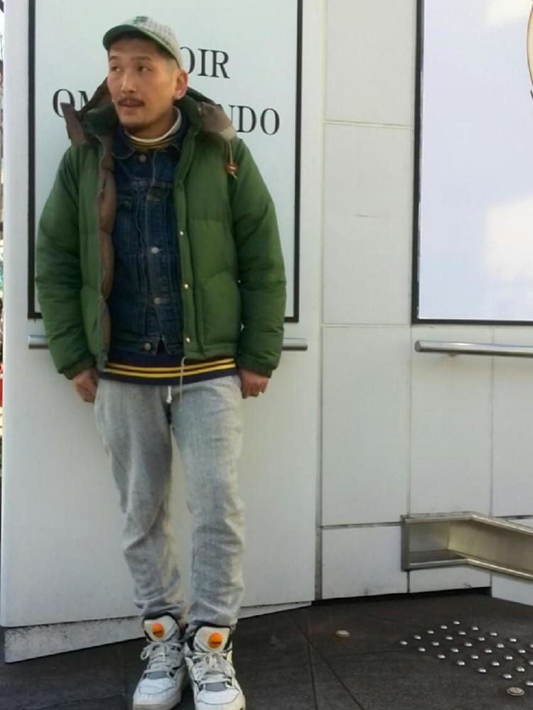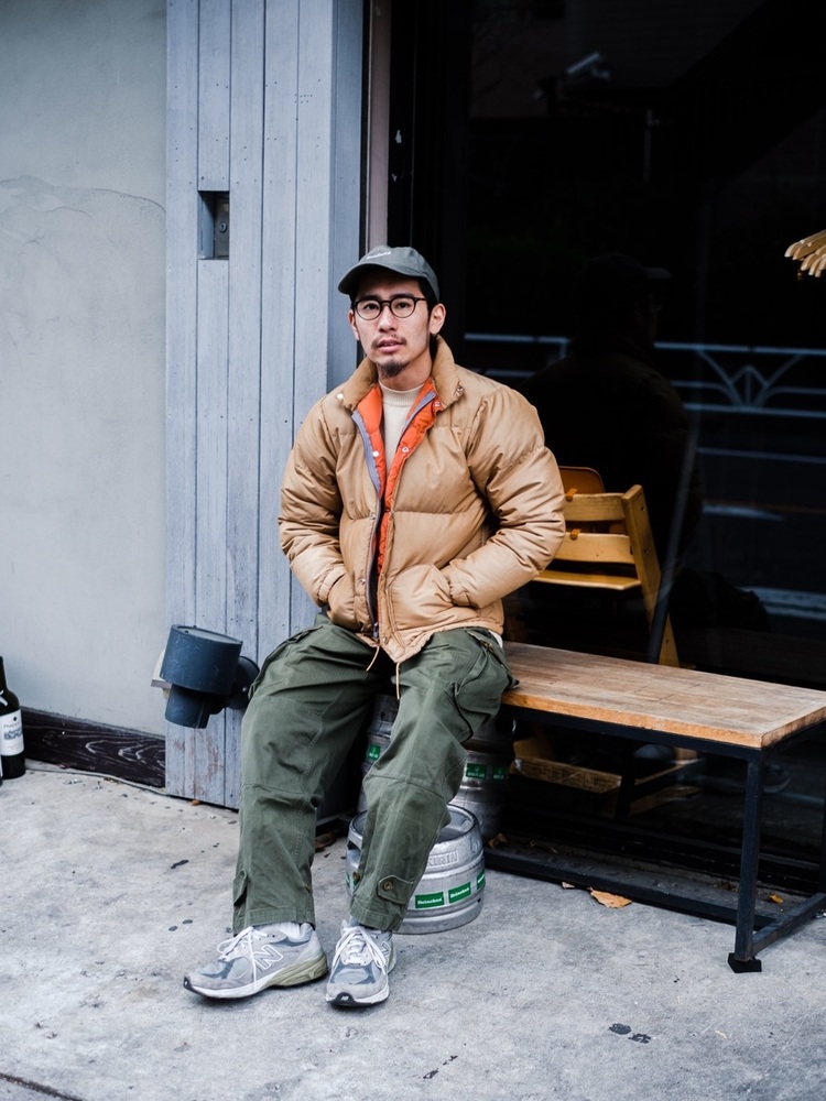 ボリュームのあるダウンジャケットにユーズドのパンツを合わせたコーデは、余裕のあるラフな着こなし。ユーズドやヴィンテージのアイテムを取り入れるだけで、こなれ感を演出できるのも押さえておきたいポイントです。