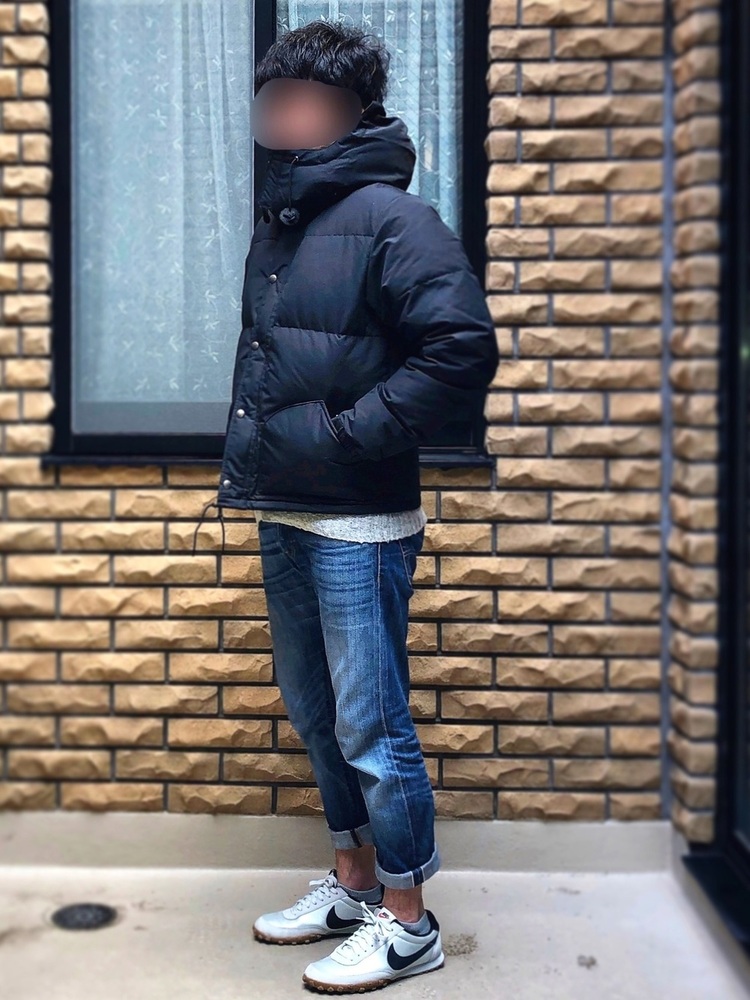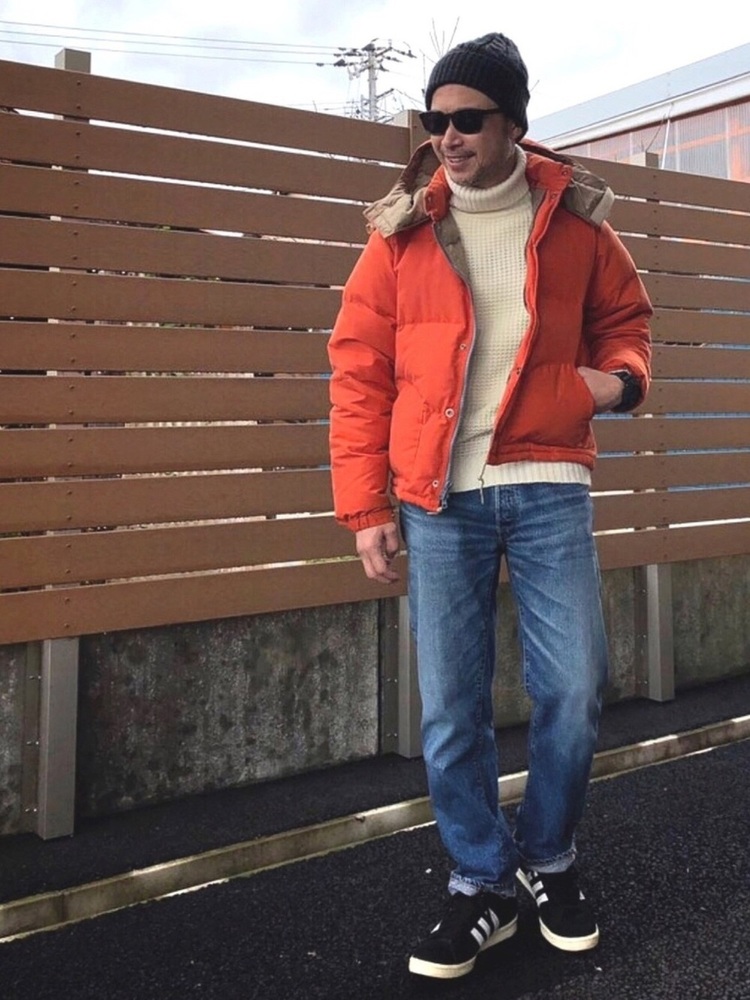 まずは、ダウンジャケットとデニムを合わせたコーデです。アウターとボトムスの色を合わせることで統一感が生まれ、コーデがまとまります。また、ロールアップしたデニムもコーデのポイントになっています。