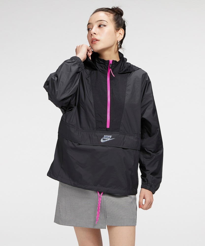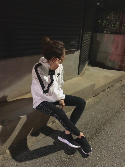 シンプルなモノトーンでまとめたコーデは、初心者の方でも簡単に真似できますね。ロゴがしっかりと見えるデザインなので、上下ナイキでそろえることでさらに統一感が出せます。ちらりと見えるリストバンドもおしゃれのポイントですね。