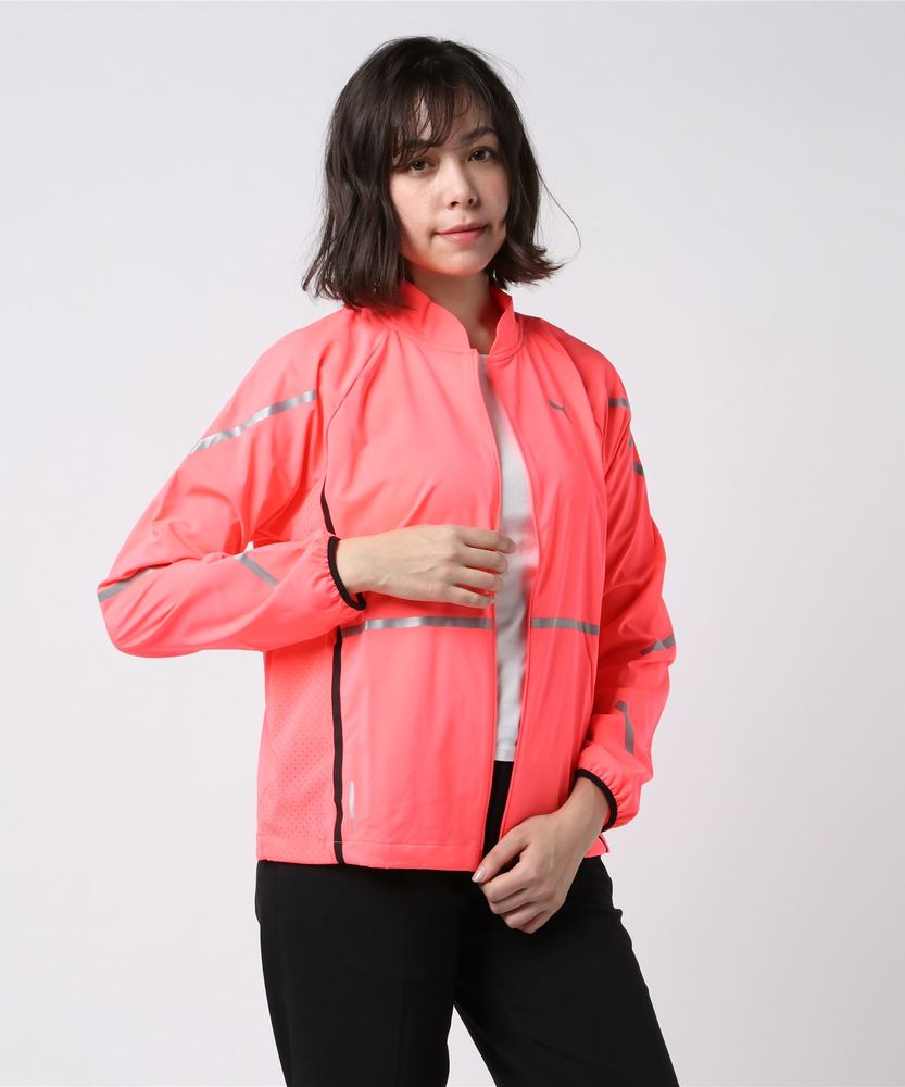 秋から冬にかけての日没が早い季節や、早朝にランニングをする方は、安全面も考慮する必要があります。こちらのPUMAのジャケットは、かわいいデザインだけでなく光を反射するラインが入っているので、夜のランニングも安全に行うことができます。裏地はメッシュ生地で蒸れにくいのもうれしいポイントですね。
