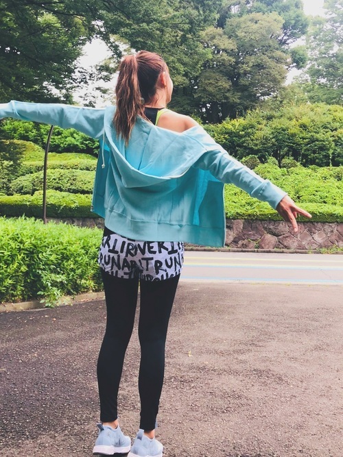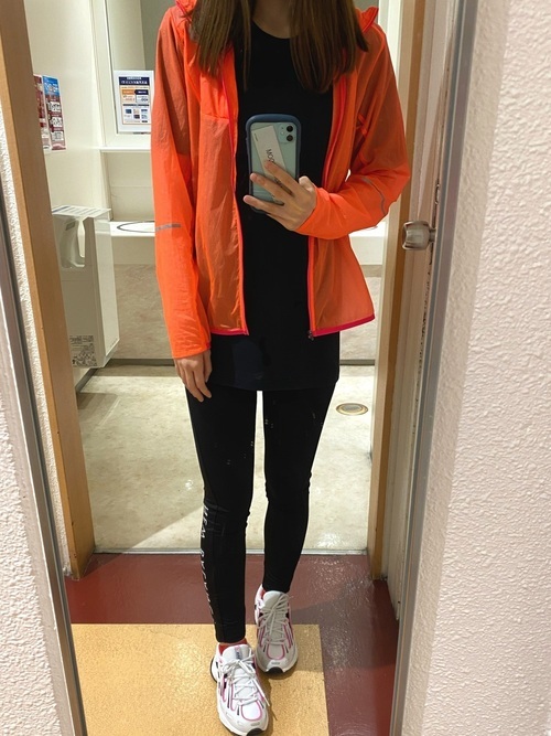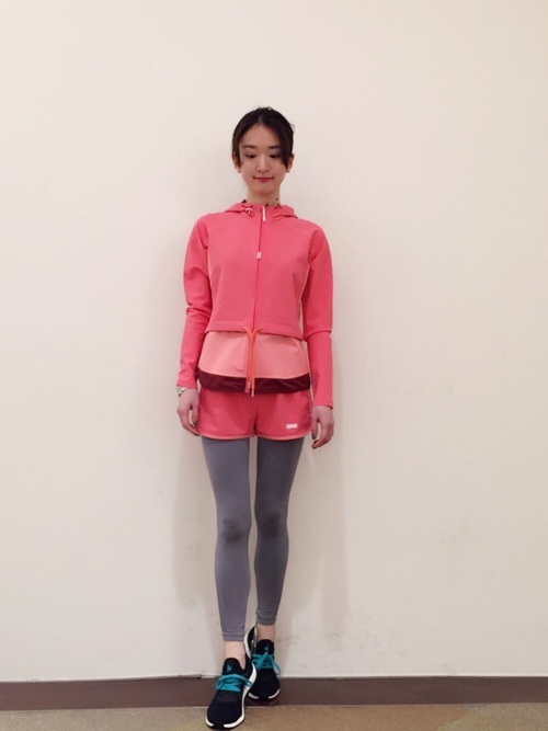 ピンクとグレーは、温かみを感じる組み合わせです。シャープなデザインが多いランニングウェアですが、色や組み合わせ次第では女性らしさを出すことも可能です。また、こちらのコーデは、短めのショーツとパーカーのウエスト部分の切り替えで、目線を上にあげることができるので足長効果も期待できます。