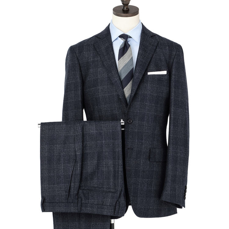 洗える ミルドストレッチ 段返り3つボタン 紺 チェック スーツ 秋冬