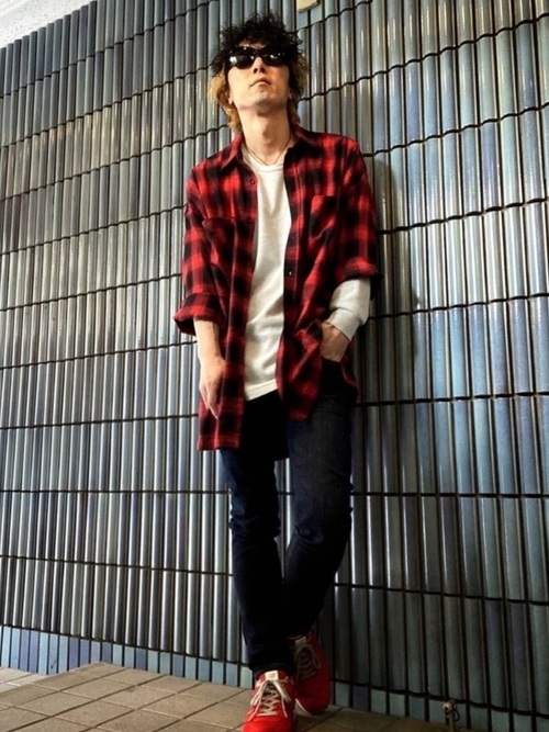 ヌーディージーンズ×ビームスのシンフィンと、赤のチェックシャツを合わせたロックなコーデです。インナーに白Tシャツを合わせて、若干の爽やかさを足していることがポイント。