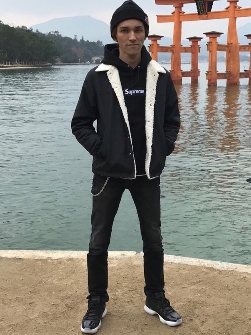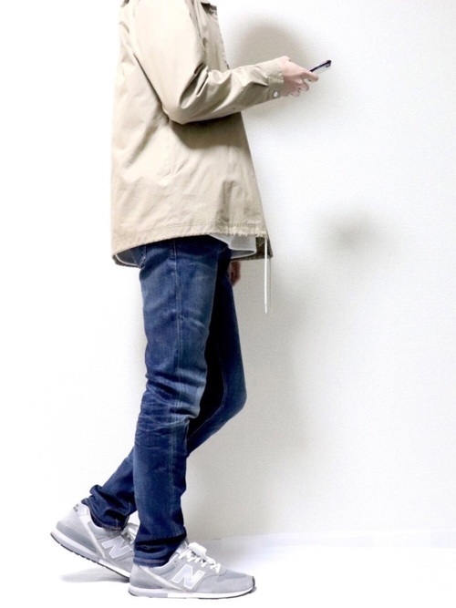 黒のシンフィンに、パーカーとナイロンジャケットを合わせて黒を基調としたコーデ。上にボリューム感があるアイテムを合わせることで、タイトなジーンズでもかっこいいメンズらしい着こなしになります。それぞれのアイテムの素材感を少しずつ変えて、コーデにメリハリをつけていることもポイントです。