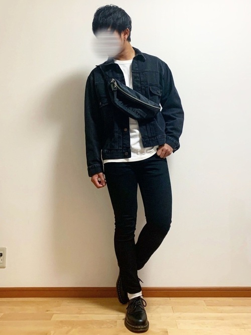 黒のリーンディーンに、白Tシャツとデニムジャケットを合わせたモノトーン風コーデ。スリム過ぎないジーンズなので、ジャストサイズのジャケットとの相性が良いです。インナーを白Tシャツにして、定番かつおしゃれな着こなしに。足下をロールアップして抜け感を出すことも忘れていません。