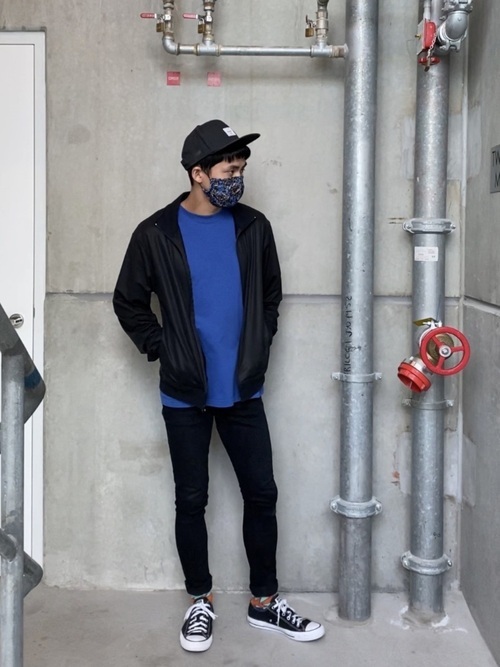 黒のスキニーリンに、ブルーのTシャツとナイロンジャケットを合わせたコーデ。スリムなジーンズに、大きめサイズのTシャツやジャケットの相性はとても良いことが分かる着こなしです。ブルーのTシャツを差し色にすることでメリハリがつき、足元のロールアップで抜け感を確保しています。