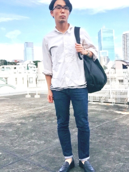 濃いブルーのシンフィンに、白シャツを合わせた定番コーデです。ジーンズと白シャツはとても相性が良く、爽やかな印象を与えます。あえてインナーにボーダーを取り入れて一味違った着こなしにしつつも、足下は革靴できっちり感をプラス。