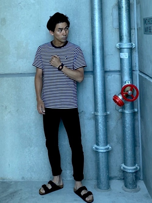 黒のスキニーリンにボーダーTシャツを合わせたラフなコーデです。細かいボーダー柄のTシャツにすることで、野暮ったいという印象を感じません。ジーンズのスリムさでラフさとスタイリッシュさのある着こなしとなっています。足下はサンダルでリラックス感をプラス。