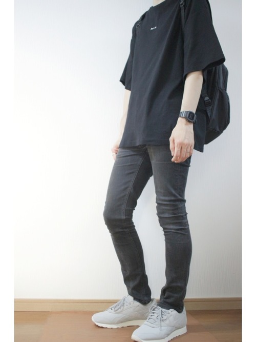 黒のタイトテリーに、オーバーサイズの黒Tシャツを合わせたカジュアルコーデです。オーバーサイズTシャツを合わせることで、タイトなジーンズの悪いイメージを払拭したかっこいい着こなしに。足下は明るいグレーのスニーカーでメリハリをつけています。