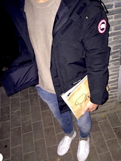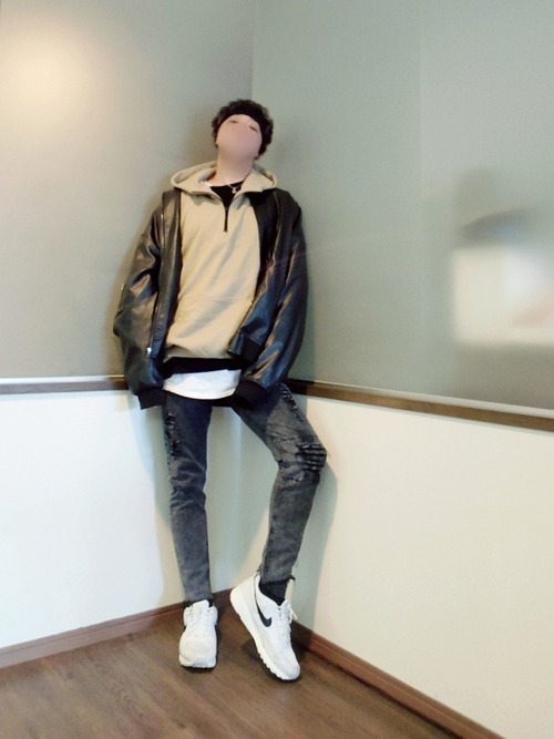 黒のリーンディーンに、ボリュームのあるパーカーを合わせたコーデです。トップスにボリュームのあるアイテムを持ってきてYシルエットを作り、おしゃれかつパーカーの野暮ったさを払拭。裾に向かいテーパードが効いたジーンズを上手く使い、すっきり見えした着こなしになります。