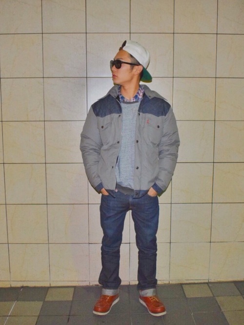 全体的に加工が入ったパイプレッドに、シンプルなダウンジャケットを合わせたコーデです。上半身をシンプルなアイテムにすることで、ジーンズの加工や淡いブルーの色味が活きた着こなしに。最後に帽子を合わせて若々しい雰囲気のあるメンズコーデの完成です。