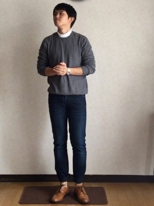 濃いブルーのスリムジムに、グレーのニットを合わせた大人の雰囲気漂うメンズコーデ。一見地味に見えますが、足下にブラウンの革靴を持ってきたり白のインナーを首元から見せたりと技ありな着こなしです。色を少なくすることで、ジーンズのヴィンテージ加工がとても活きています。
