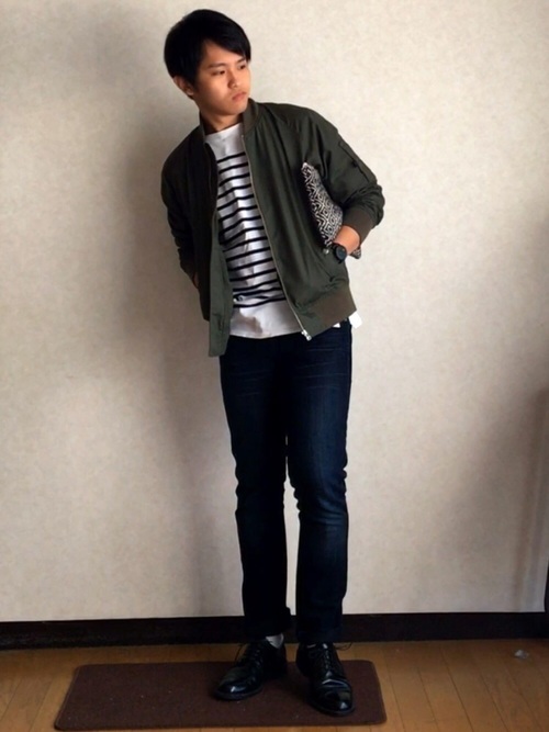 濃いブルーのスリムジムに、ボーダーTシャツとMA-1を羽織った爽やかコーデです。あえてラフさのあるボーダーTシャツをインナーにすることで、程よいカジュアルさがある着こなしに。足下に革靴を合わせてきれいめな印象を後押ししています。