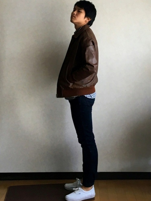 ヴィンテージ加工のスリムジムに、ブラウンライダースを合わせたワイルドなメンズコーデです。ジャケットとジーンズ共に男らしい印象ですが、インナーの少し見えるシャツが親しみのある雰囲気を醸しています。足下の白い靴で清潔感も大事に。