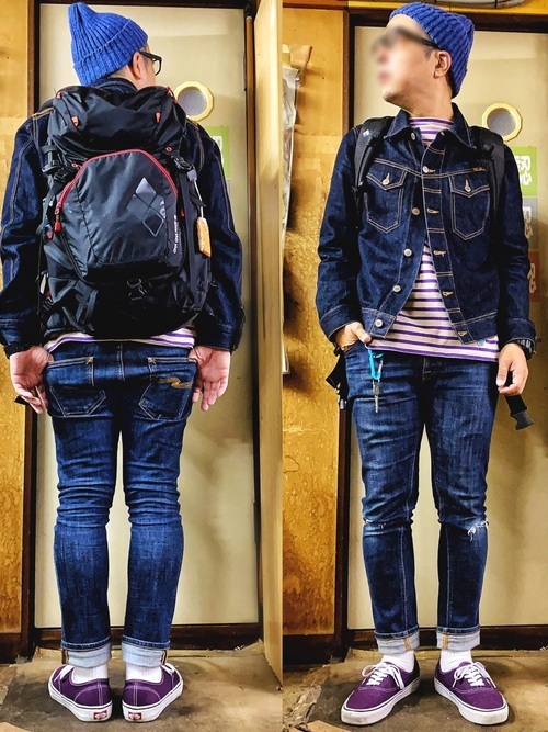 濃いブルーのシンフィンにデニムジャケットを合わせた、デニム×デニムコーデです。一見男らしい堅い印象ですが、紫のスニーカーと同色のボーダーTで程よいカジュアルさがある着こなしに。ヌーディージーンズのダメージが魅力的な、かっこよさとカジュアルさが共にある大人のジーンズコーデです。