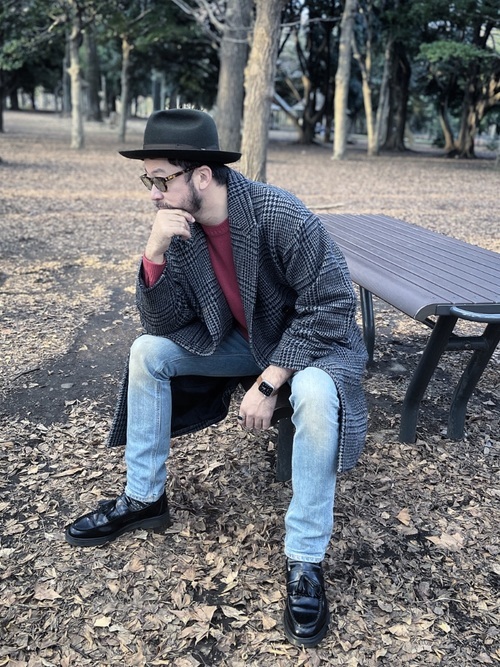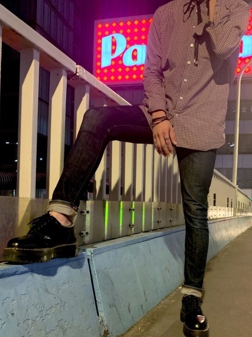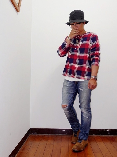 ひざにクラッシュ加工が入ったルートクヌートに、チェックシャツを羽織ったワイルドさとカジュアルさが程よいコーデです。プルオーバーのシャツにすることで柔らかい雰囲気が合わさり、ワイルドになりすぎず程よく調和しています。
