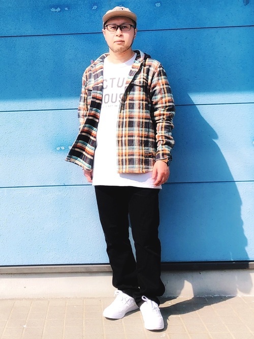 黒のスリーピーシックステンに、Tシャツとチェックシャツを合わせたストリートコーデです。Tシャツも丈が長めのアイテムを取り入れて、ゆるっとしたシルエットの着こなしに。チェックシャツで彩をプラスしつつ、Iラインを強調しているので野暮ったさを感じません。