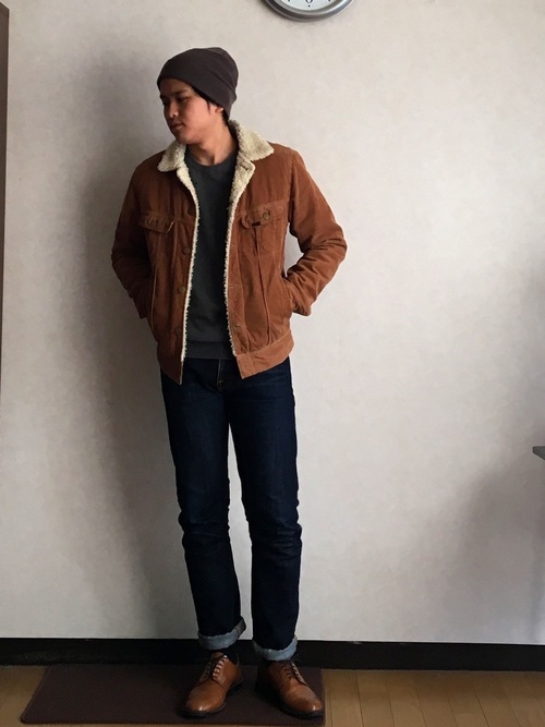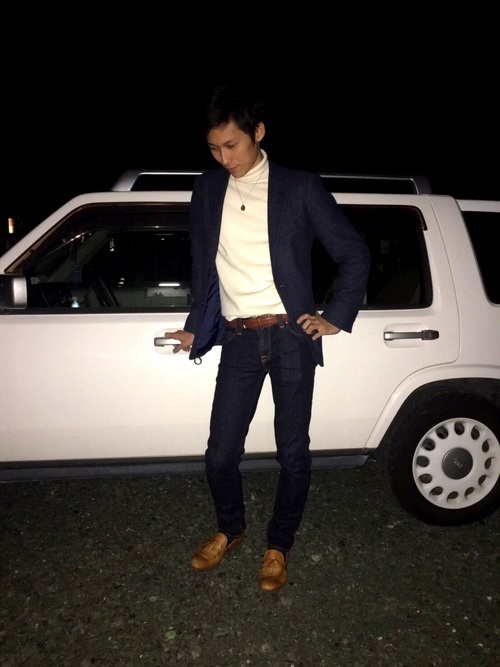 濃いブルーのストレートアルフに、秋に活躍するジャケットを合わせたコーデ。インナーを濃いグレーにして、ジャケットメインにした着こなしです。裾をロールアップしこなれた雰囲気を醸し、革靴で上品な印象に。