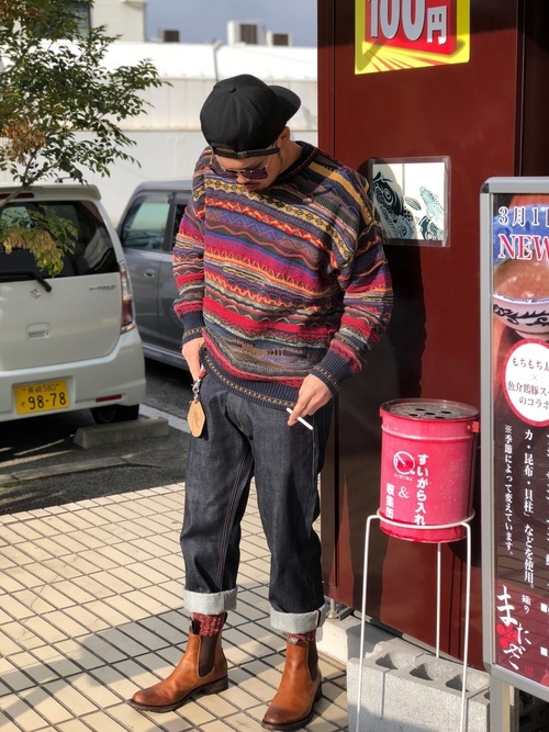 濃いブルーのルーズリーフに個性的なニットを合わせたメンズコーデです。濃い色のジーンズにすることで、派手なニットとも馴染み個性的な着こなしに。足下にブーツを合わせて、ブーツの上までロールアップすることですっきりさと洒落っ気があります。ニットにある色を合わせることで調和した技ありなコーデです。