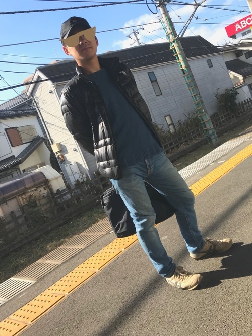 ライトブルーのグリムティムに、ダウンジャケットを合わせたコーデです。ヴィンテージ風のジーンズに洒落っ気があり、トップスをシンプルにすることでジーンズの良さがひき立つ着こなしに。足下を白いスニーカーにしてキレカジコーデの完成です。