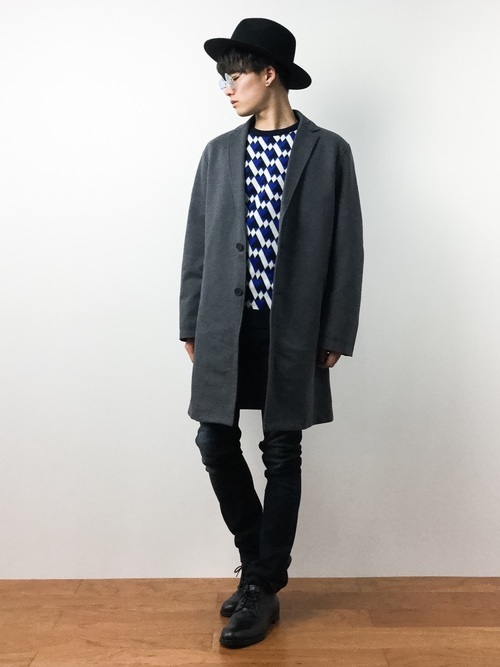 濃いブルーのグリムティムに、グレーのアウターを羽織ったコーデです。アウターとインナーを明るさの違うグレーで合わせて落ち着いた印象の着こなしに。ジーンズを濃いブルーにすることでコントラストが付き、雰囲気漂うコーデとなっています。