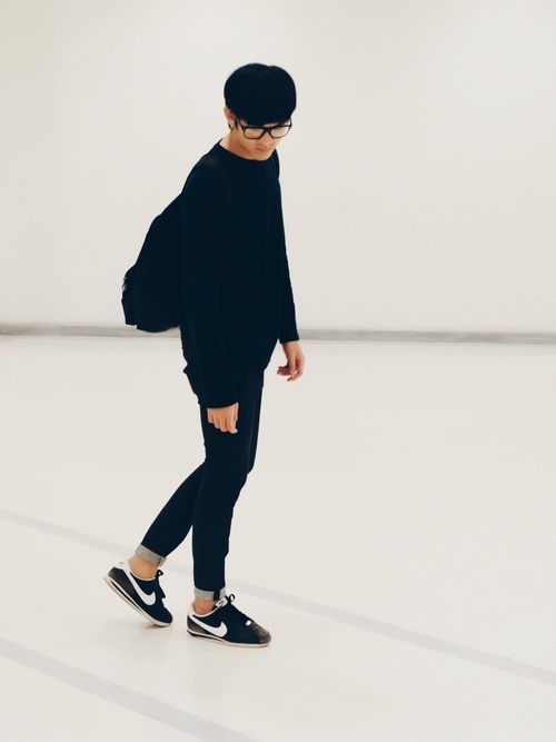 黒のタイトロングジョンに、オーバーサイズのスウェットを合わせたオール黒のコーデです。黒の異素材であるスリムジーンズを取り入れることで、シルエット的にもメリハリの付いた着こなしに。足下はロールアップして抜け感をプラスして、スニーカーでラフさを足しています。