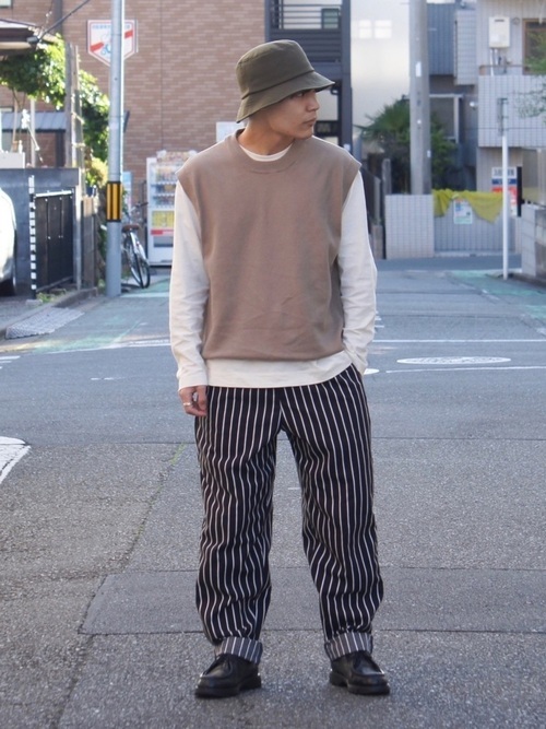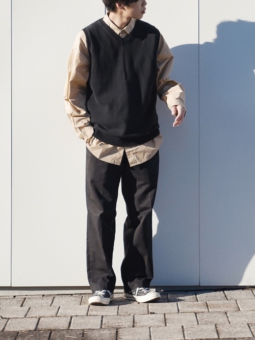 流行りのニットベストは、インナーのTシャツとレイヤードスタイルを作りやすく、よりきれいめな印象に仕上げてくれます。インナーのTシャツは少し大きめサイズをチョイスすると、全体がきれいなシルエットに仕上がります。