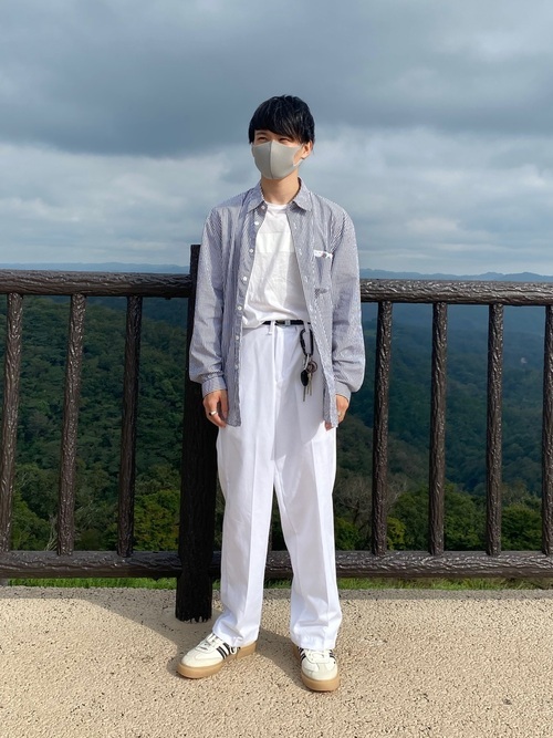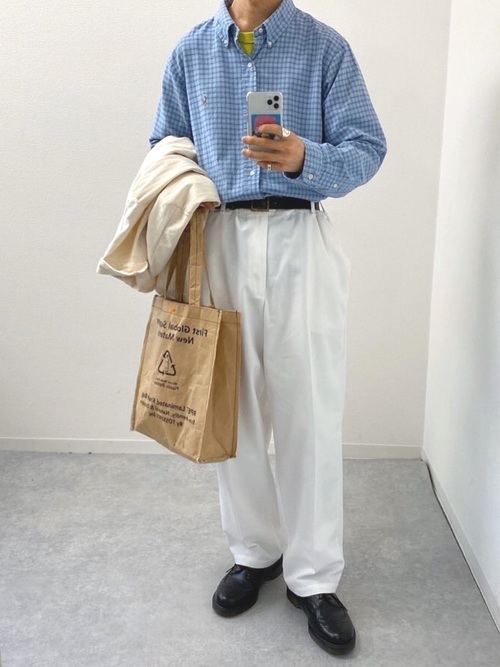 こちらのコーデはインナーに白Tシャツを持ってきて、サッとシャツを羽織り清潔感のあるコーデに仕上げています。さらにタックインスタイルにすることで一層清潔感を醸し出しています。着こなし方も工夫しておしゃれコーデを作ってください。