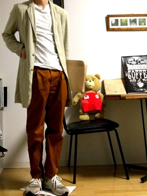 パンツの色も注目してください。渋めの色味は大人男性とマッチします。革靴とも相性が良いので、足下がごちゃごちゃすることなく、コーデに馴染みやすいのです。