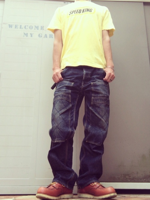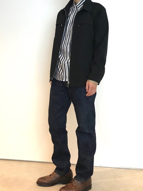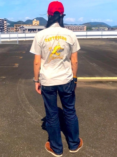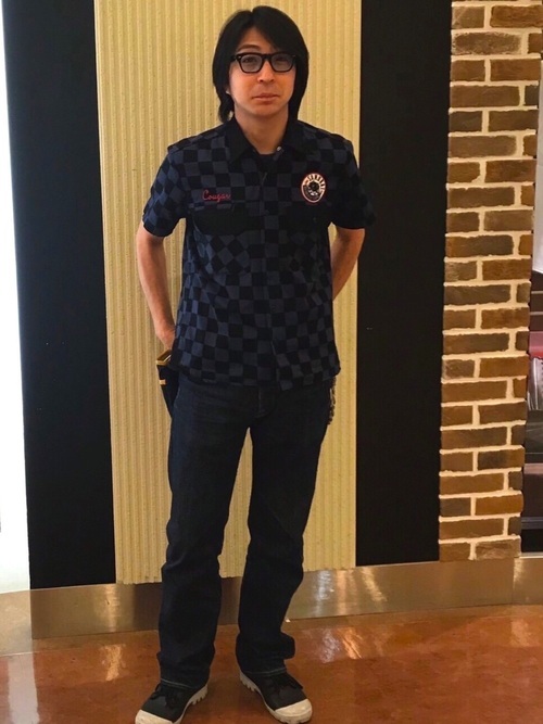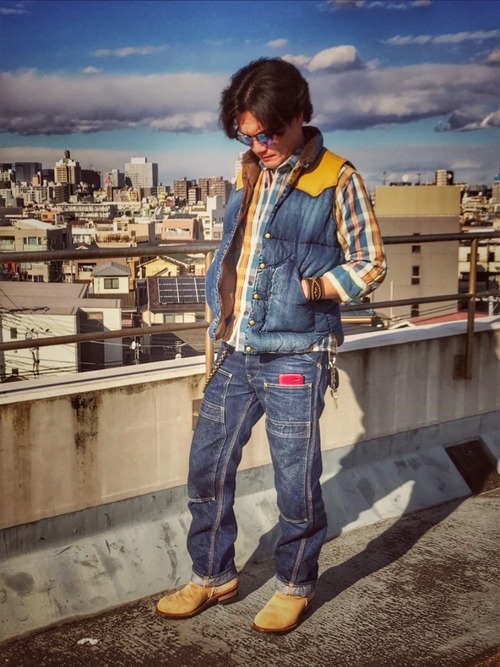 柄シャツにサムライジーンズのデニムパンツというアメカジ風コーデ。全体的には同系色でまとめつつ、黄色が差し色になっていてセンスが光ります。サムライジーンズらしい、独特の特徴があるデニムパンツをうまく着こなしているコーデです。