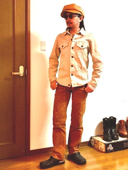 デニムにデニムというアメカジスタイル。ホワイト系のデニムにサムライジーンズのブラウン系デニムという、デニムにしては少し変わった色のコーデです。キャスケットも同系色にすることで、まとまった印象になっています。
